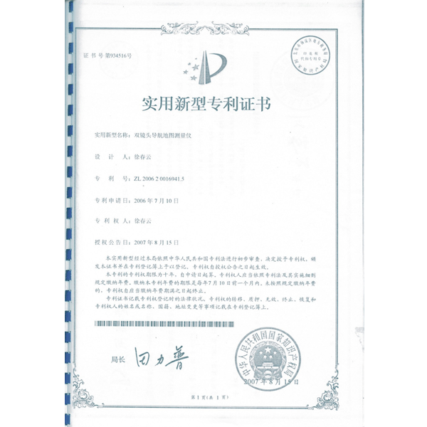 雙鏡頭導航地圖測量儀專利證書